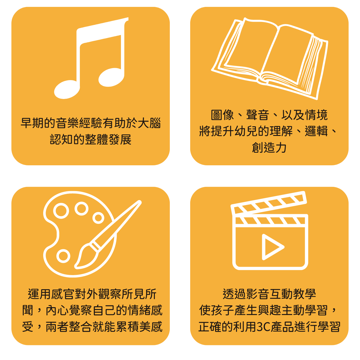 幼兒課程將綜合音樂、故事、美學以及影音 進行教學: